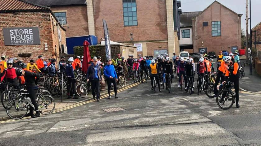 The circular ride around a 54‑mile course taking in Bedale, Catterick, Leyburn, Middleham and Masham, and a circuit of approximately 33 miles for junior and less experienced cyclists, started and finished outside The Storehouse Bar and Eatery on Blossomgate.