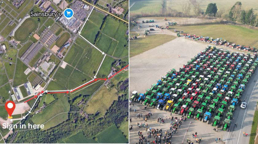 A bird's-eye view of brown gate at the Great Yorkshire Events Centre & tractors gather for the 2025 event.