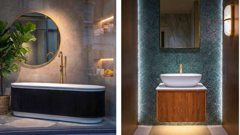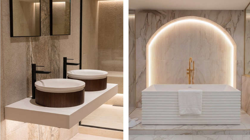 Visitors can explore bathroom environments, including sculptural stone freestanding baths, ambient walk-in showers, handcrafted brassware, and rich natural stone finishes.